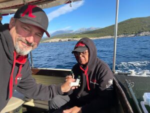 Eine besondere Herausforderung stellte das Angeln von den bereitgestellten Booten dar. Diese sind in Montenegro deutlich anders ausgestattet, als wir es von unseren heimischen Gewässern gewohnt sind. Vor allem das Handling der langen 5-Meter-Ruten erwies sich als anspruchsvoll. Durch die festen Sonnenschutzvorrichtungen an Bord ist der Platz eingeschränkt, was präzise Bewegungen erschwert und das Werfen sowie das Landen der Fische zu einer echten Übung in Koordination macht.